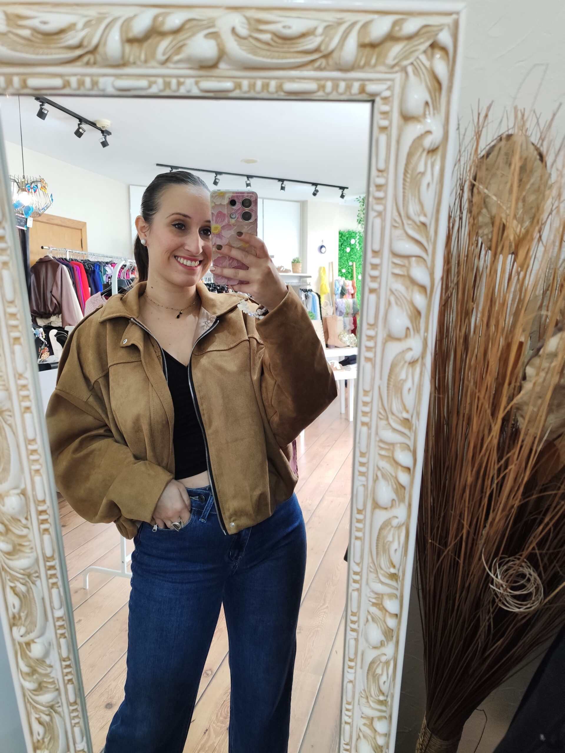 Chaqueta de antelina con forro, oversize, con manga murciélago, y abrochada con cremallera.