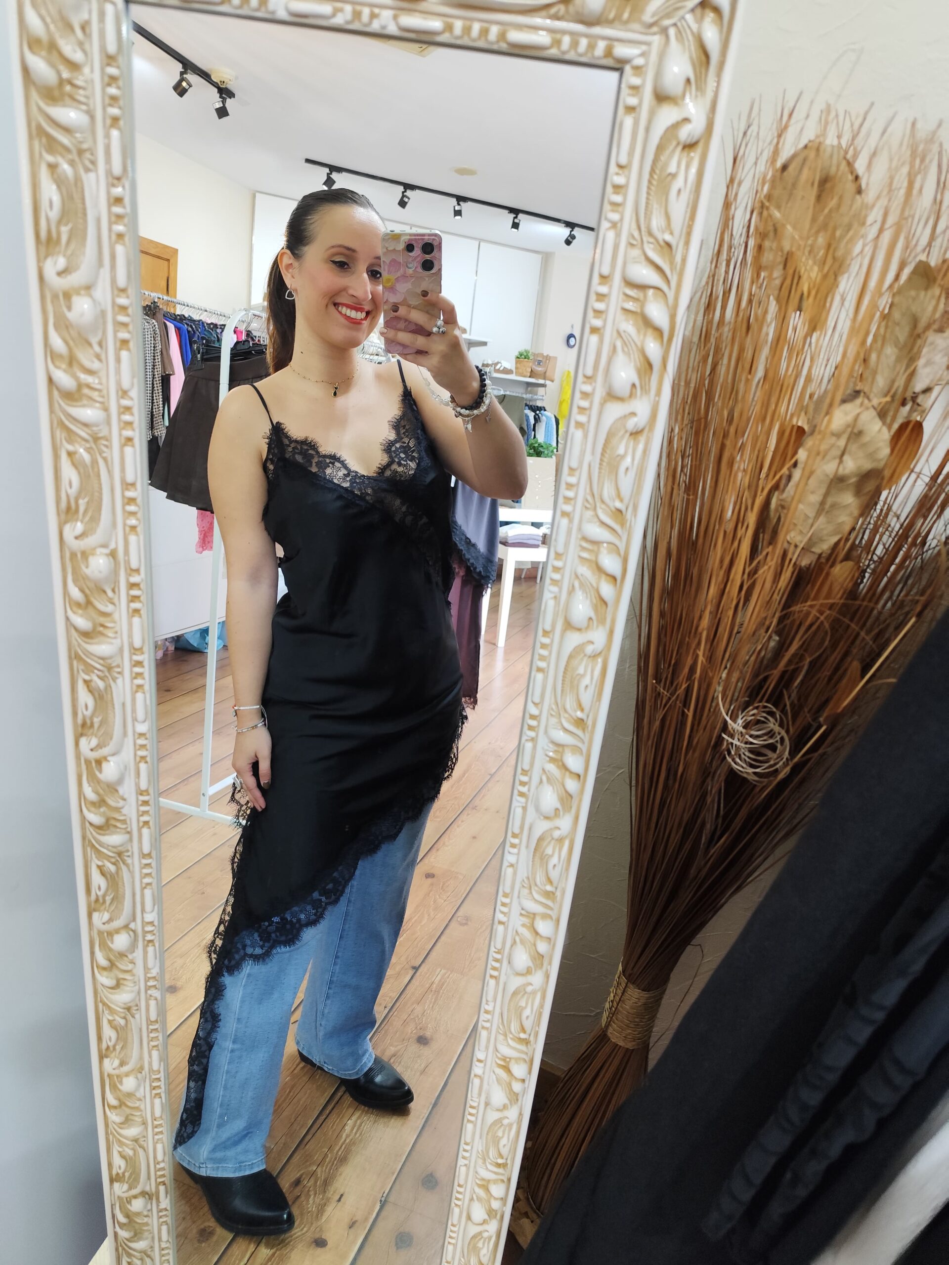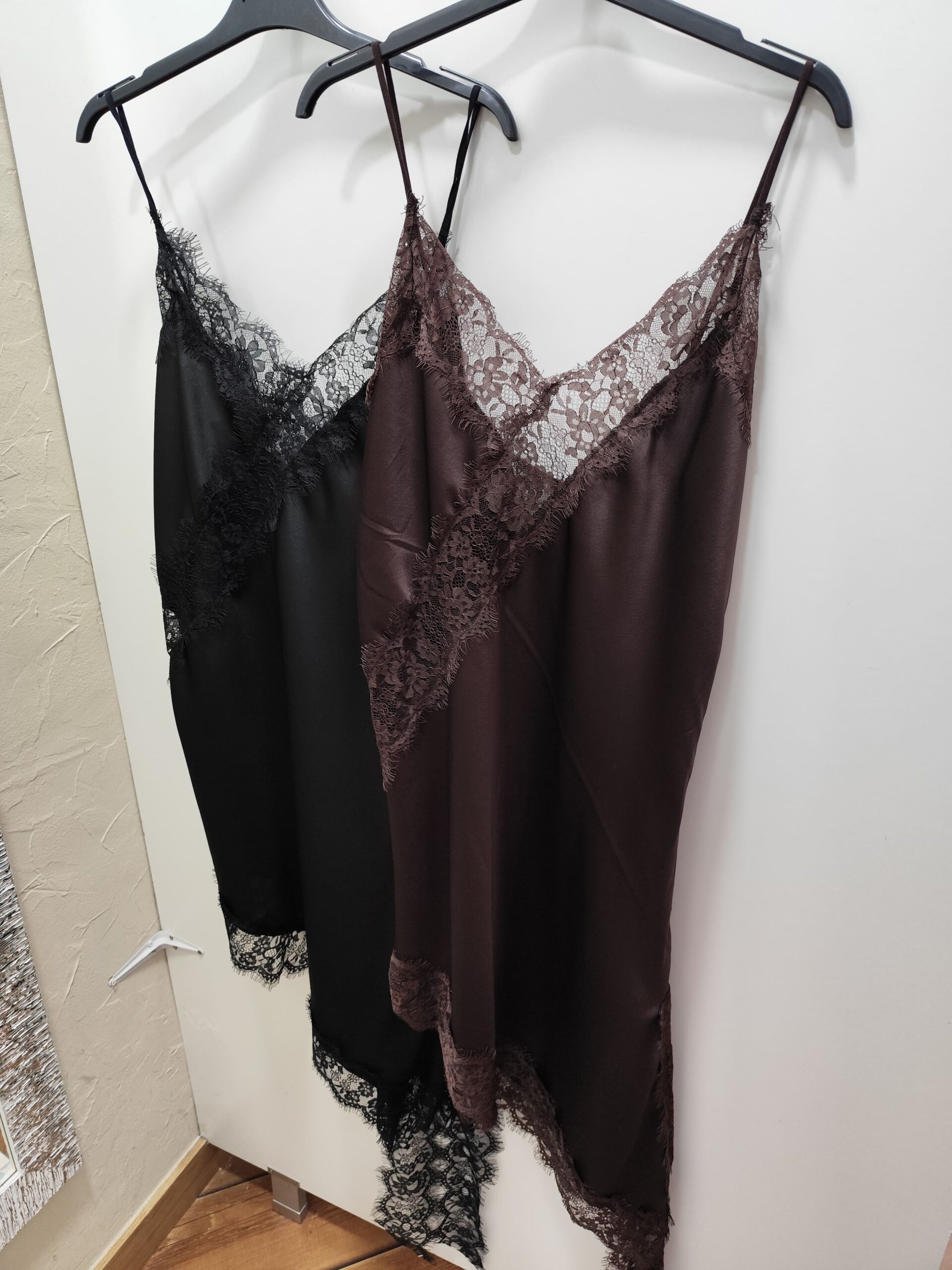 Lencero largo que se puede usar como vestido también, confeccionado en raso con encaje, y con el bajo asimétrico, con abertura.